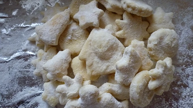 Krok 1: Z mouky, Hery a šlehačky udělám těsto, nechám do druhého dne odpočinout. Pak vyválím plát asi 4 mm silný a vykrajuji různé tvary.