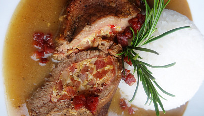 Krok 6: Ve výpeku opečeme do hněda cibuli, lehce podlijeme poté vodou a nalijeme do hrnce na opečené kapsy. Dusíme do měkka dle stáří a kvality masa. Poté co jsou kapsy měkké, vyndáme je z hrnce – odstraníme jehlice a udržujeme teplé. Vzniklou šťávu zahustíme troškou hl. mouky, kterou si rozmícháme ve studené vodě a přidáme do šťávy. Poctivě promícháme a za pravidelného míchání necháme provařit cca 15 minut.