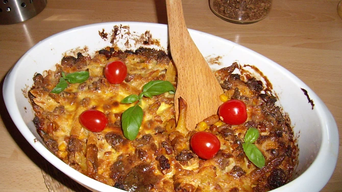 zapečené těstoviny s mletým masem a zakysanou smetanou,