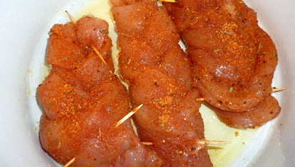 Krok 4: Tři proužky dáme na sebe a konec zpevníme párátkem. Poté proužky kuřecího masa upleteme jako vánočku a konec zajistíme párátkem. Povrch kuřecí pletýnky ještě opět posypeme kořením a položíme ji do rozpuštěného másla.