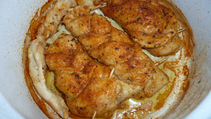Krok 5: Formu dobře zakryjeme alobalem a vložíme do vyhřáté trouby na 170°C a pečeme asi 45 minut. Poté alobal odstraníme, pletýnky polijeme výpekem a dáme asi na 5 minut ještě zapéct. Před podáváním párátka odtraníme. Podáváme s bramborovou kaší.
