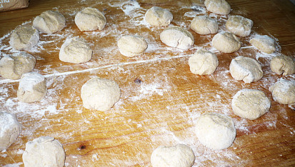 Krok 3: Po vykynutí těsto promáčkneme, krátce prohněteme a rozdělíme na 4 díly. Každý díl rozdělíme na 6 částí, ze kterých vytvarujeme kuličky. Každou kuličku potřeme vodou a spojíme do tvaru kytiček.