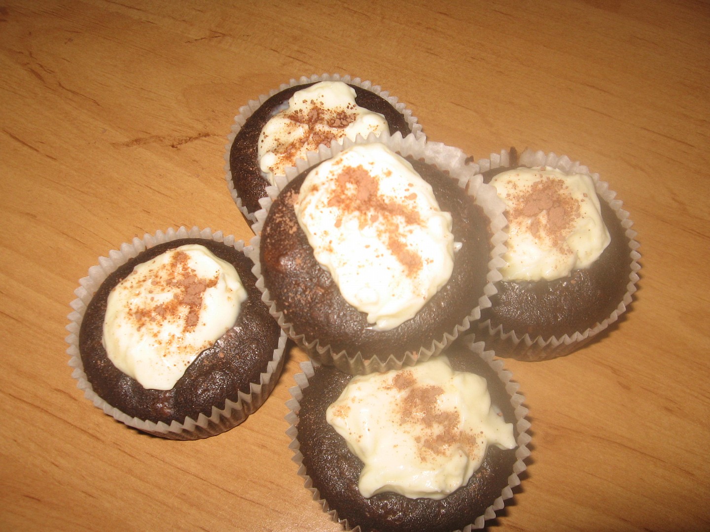 Krok 5: Ušleháme pevnou šlehačku a těsně před podáváním ji naneseme na bábovičky. Poprášíme kakaem a podáváme.