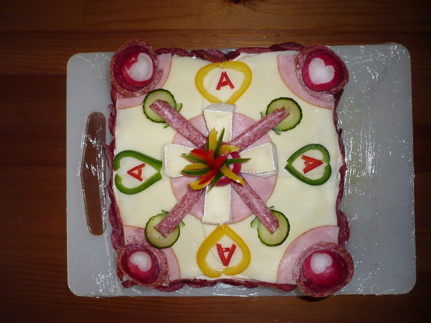 Krok 2: Potom skládáme dle vaší fantazie světlý chléb a tmavý chléb, mažeme pomazánkami a vrstvíme dalšími chleby. Jakmile je hotovo, pomažeme ze všech stran a z vrchu tou větší pomazánkou a dle vaší fantazie zdobíme. ;-)