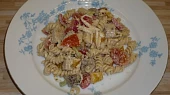 Krok 3: Do velké mísy nakrájíme zeleninu na menší kousky, přidáme hotové maso, okapané těstoviny, zakysané smetany, promícháme a ještě dochutíme dle chuti.