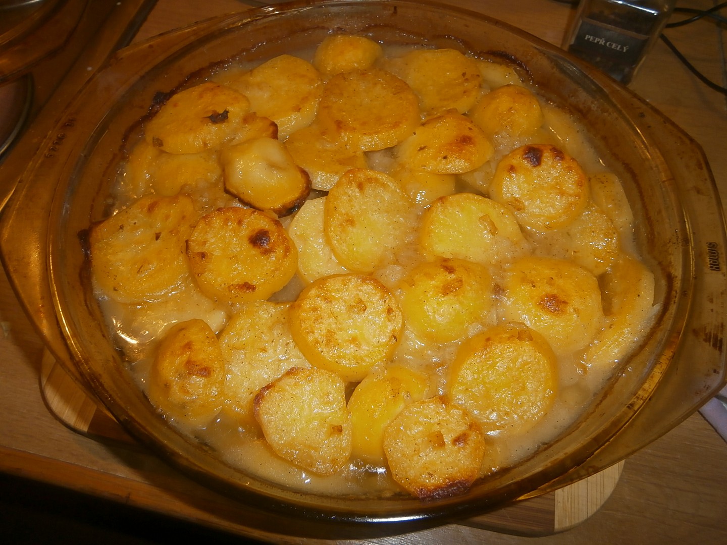 Krok 2: Oloupeme brambory a nakrájíme na plátky, asi 1 cm silné, naskládáme do vymazaného pekáče. Jednu vrstvu naspod a po stranách, osolíme, opepříme.