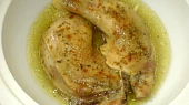 Krok 1: Stehýnka posolíme a lehce posypeme oreganem a trochou mleté papriky. Dáme do mikrovlnky na cca 40 minut při výkonu 200 W. Záleží na typu mikrovlnky. Můžeme občas polít šťávou.