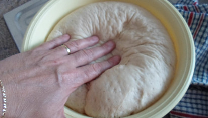 Krok 1: Těsto vypracujeme v pekárně. Suroviny dáme je v pořadí, jak jsou uvedeny. Vůbec se nelepí, skvěle se s ním pracuje.