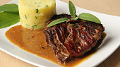 Krok 4: Na oleji maso zprudka z obou stran opečeme dohněda, můžeme přidat zbytek šunky a šalvěje, podlijeme nejprve vínem, necháme odpařit a poté přilijeme vývar.