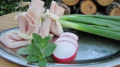 Pomazánku do šunky zabalíme a pod balíček vsuneme rozpletený korbáčik. Oba konce korbáčiku zvedneme a překřížíme . Balíček otočíme a uděláme uzlík. Místo šunky můžem použít i měkký plátkový sýr. Krok 3: Měšce uděláme tak, že zvedneme všechny čtyři rohy šunky a korbáčikem svážeme k sobě. Krok 4: Hotové výrobky položíme třeba na chleba, tousty nebo na půlku bulky.