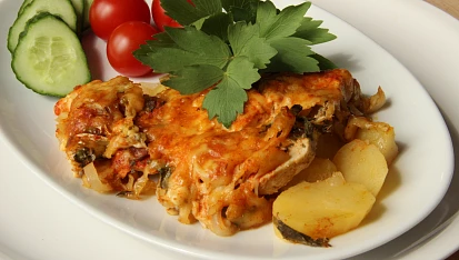 Krok 1: Brambory oškrábeme, omyjeme a nakrájíme na plátky silné cca 0,5 cm. Poklademe jimi dno zapékací misky nebo pekáčku a mírné osolíme.