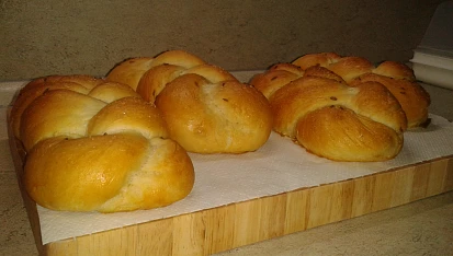 Krok 3: Těsto si rozdělímena 4 díly. Z každého dílu vyválíme 3 dlouhé válečky o síle asi 1,5 cm a zapleteme pletýnku. Položíme na plech, přikryjeme utěrkou a necháme ještě 15 minut dokynout.