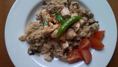 kuskus s kuřecím masem a žampionovou omáčkou,