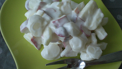 Osvěžující salát je skvělým doplňkem k hlavnímu chodu nebo také jako samotná svačina. Kombinace štiplavých ředkviček a sladkých jablek je sice netradiční, ale o to chutnější. Spojení kousků zajistí jogurt. Nejlépe pak salát chutná vychlazený.