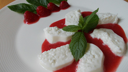 Krok 5: Několik hodin chladíme v lednici, pak nakrájíme na plátky stejně jako mozzarellu do klasického caprese salátu a dozdobíme jahodami s mátou. Protože jsem měla jen jahody mražené (viz poznámka), rozmixovala jsem je s trochou cukru.