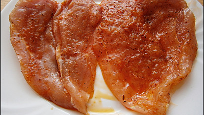 Krok 1: Prsa opláchneme, osušíme a prořízneme do tvaru motýlích křídel. Ze lžíce oleje a špetky koření si připravíme marinádu, kterou vetřeme do připraveného masa, vložíme do misky, nebo jen do obyčejného igelitového sáčku a necháme alespoň 1/2hodinky odležet.