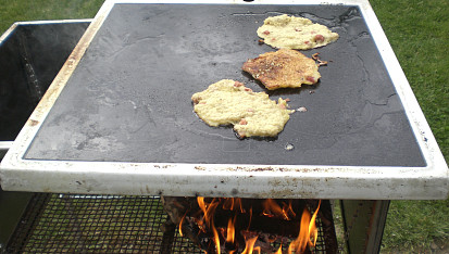 Krok 5: Smažíme na rozpálené kamenné desce na grilu. Kámen můžeme lehce potírat sádlem. Můžeme přidat špetku kurkumy pro lepší trávení, ale těsto dostane žlutou barvu.