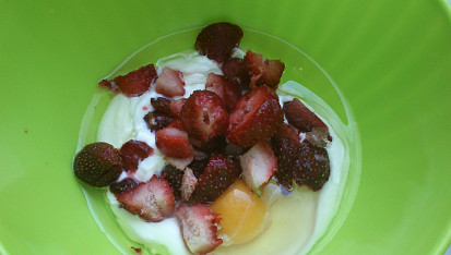 Krok 1: Vejce, jogurt, olej rozmíchat, přidat kousky jahod, cukr a mouku smíchanou s práškem do pečiva. Rozmíchat a nakonec přidat čokoládu.