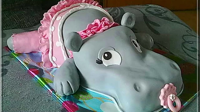 Krok 13: Druhý den, když jsou dorty dostatečně tuhé pro další manipulaci, vezmeme cca 900g potahovky, obarvíme černou a bledě modrou gelovou barvou na požadovaný odstín kůže hrošíka. Rozdělíme na půl a vyválíme na takovou velikost, aby placka pokryla dort. Opatrně dlaněmi urovnáváme a uhlazujeme. Přebytek hmoty odkrojíme rádlem.