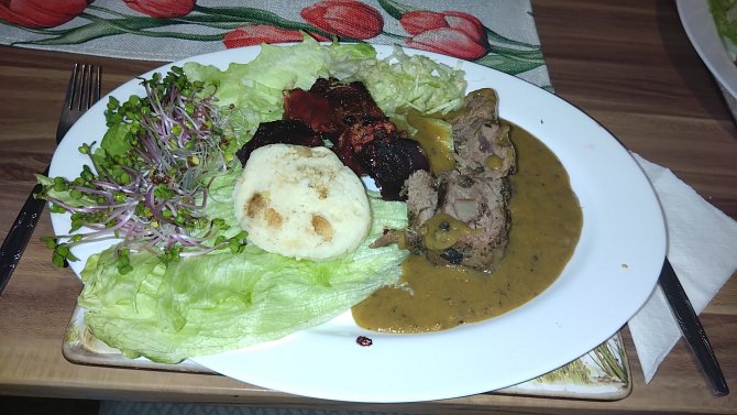Vepřová roláda, cuketové zelí a karlovarský knedlík