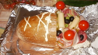 Krok 2: Na dno chleba jsem dala listy čínského zelí, na nej pak vlašský salát a pak jsem jen vrstvila salámy tak, aby to pěkně drželo a udělalo tvar boty.