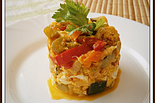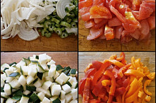Na oleji orestujeme cibuli s řapíky.Přidáme rajčata a chvíli dusíme.Přidáme zbytek zeleniny,okořeníme a pod pokličkou opět dusíme