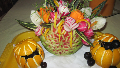 Krok 1: Meloun vyřežeme dle fantazie - vydlabeme vnitřek - do dutiny střídavě poklademe šunku, sýr a Herkules, asi tak 1 cm pod nejspodnější okraj.