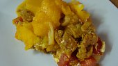 Krok 3: Odležené maso zprudka opečeme na rozpálené pánvi. Opečené maso osolíme, přidáme nakrájená rajčata, nakrájenou cibuli, promícháme.