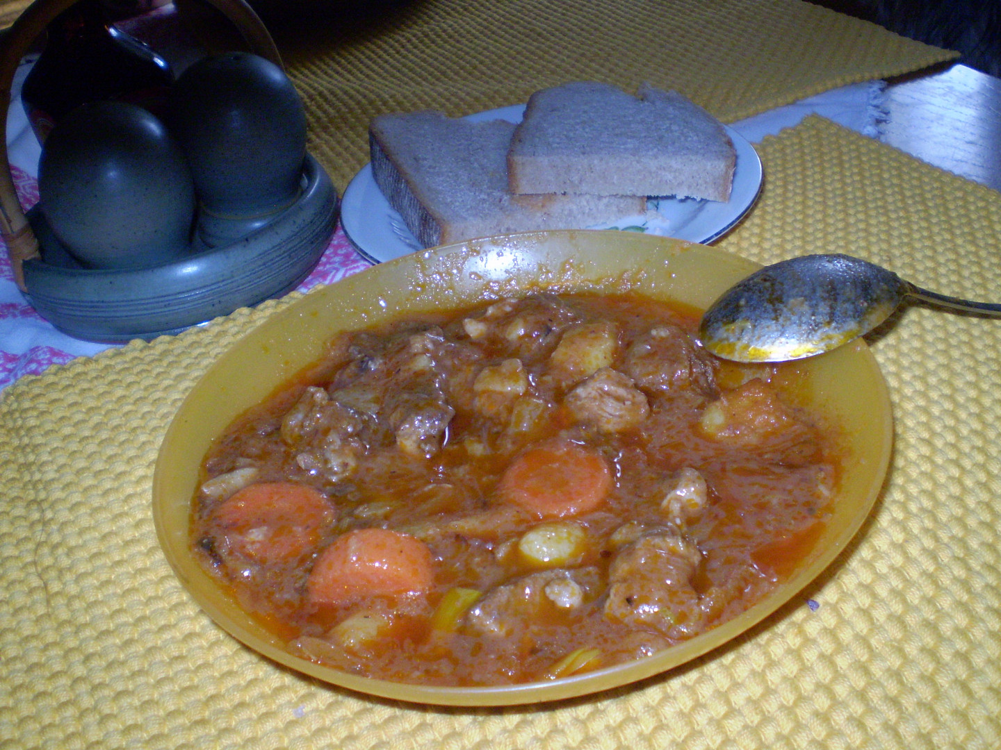 Krok 4: Když je orestováno, dáme kuličky pepře, nové koření, bobkové listy a rajčatový protlak. Všechno promícháme a přidáme k masu, zalijeme hovězím vývarem a můžeme přidat červené víno.