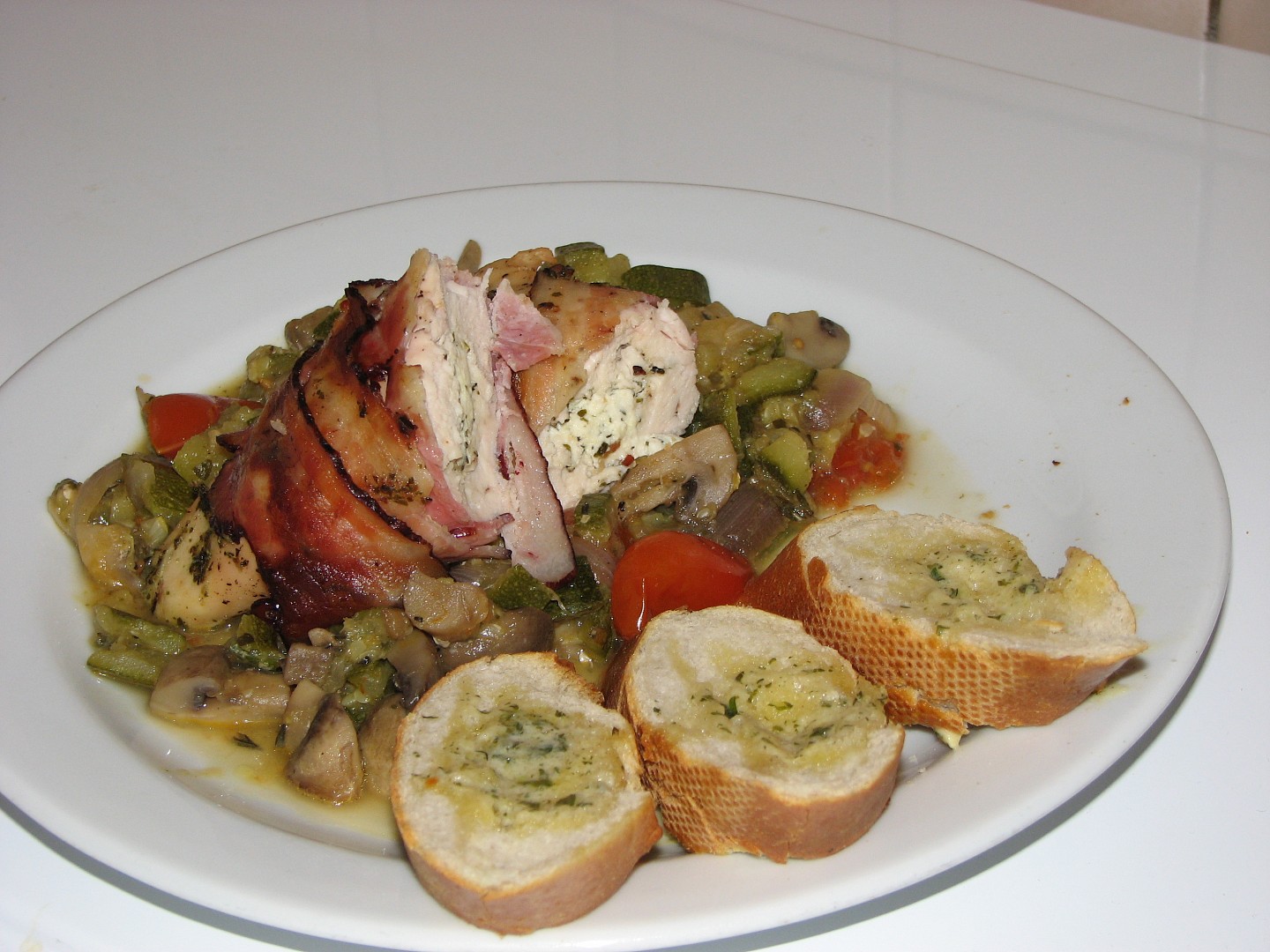 Na zelenině pečená, kozím sýrem plněná, kuřecí prsa