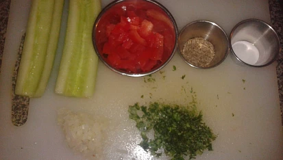 Krok 1: Okurku obrátíte a několikrát podélně překrojíte. Poté svisle nakrájíte na kostičky. Do jogurtu přidáte 2 až 4 lžíce vody, dle hustoty jogurtu. Na jogurt nasypete všechnu zeleninu. Osolíte. Vše pečlivě smícháte dohromady.