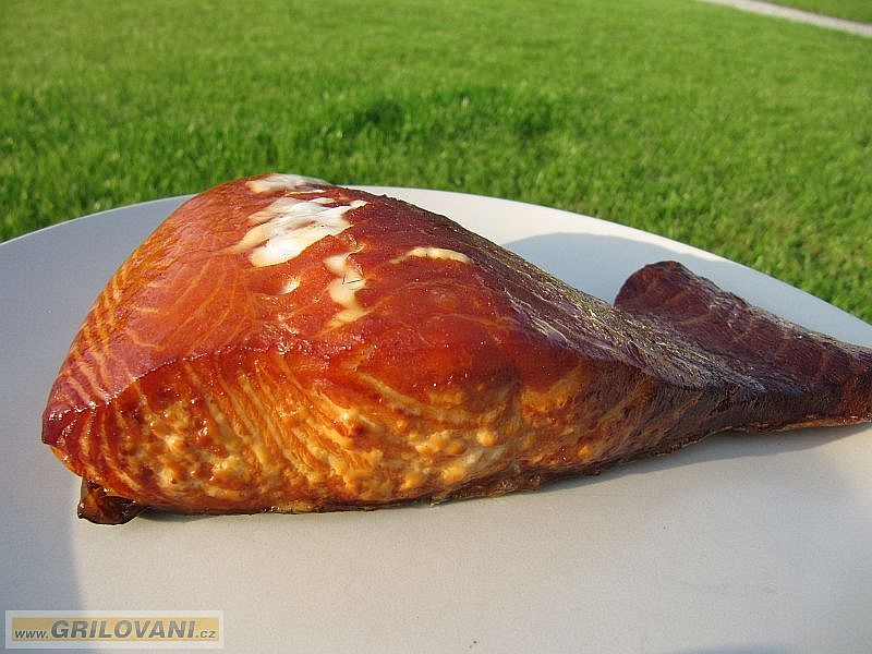 Uzeného lososa si snadno připravíte i na grilu – stačí použít dřevěné udicí lupínky a grilovat nepřímou metodou. Namočení v rumu a marinování pomocí třtinového cukru, soli a pepře mu dodá jemně nasládlé kouřové aroma a dokonale šťavnatou chuť.