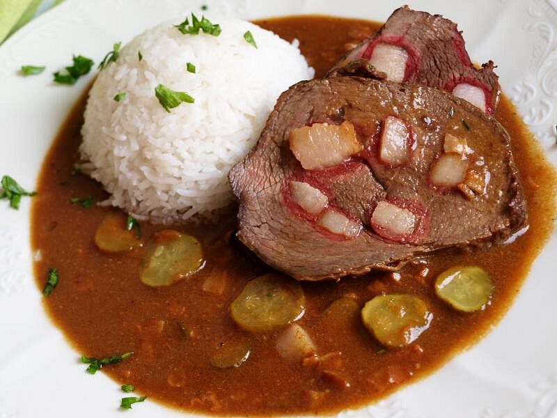 Cibuli nakrájíme nadrobno. Krok 2: Osolíme, opepříme a na rozpáleném sádle zprudka ze všech stran osmažíme dohněda. Krok 3: Maso odložíme stranou a ve výpeku osmažíme cibuli dozlatova. Krok 4: Přidáme mouku a usmažíme tmavší jíšku. Krok 5: Přidáme hořčici a zalijeme vývarem nebo vodou. Krok 6: Vložíme maso a pod poklicí dusíme doměkka. V průběhu dušení kontrolujeme. Je-li třeba, podlijeme znovu vývarem nebo vodou. (V této fázi je možné použít pomalý hrnec a připravovat pokrm v něm.) Krok 7: V rendlíku osmahneme na kostičky nakrájený zbytek slaniny, přidáme nakrájené okurky a krátce restujeme. Krok 8: Měkké maso vyjmeme, nakrájíme na jednotlivé porce a šťávu z masa přecedíme přes jemné sítko do rendlíku se špekem a okurkou. Krok 9: Necháme krátce provařit. Krok 10: Dochutíme podle potřeby solí a zjemníme kouskem čerstvého másla. Krok 11: Podáváme s rýží nebo knedlíkem.
