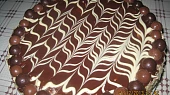 Krok 5: Boky ozdobíme plátky mandliček. Vrch zdobíme hořkou a bílou čokoládou. Kraje jsou ozdobeny marcipan. kuličkami v čokoládě