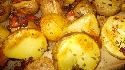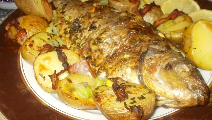 Pečený okáč s bylinkami, bobkovým listem a česnekem