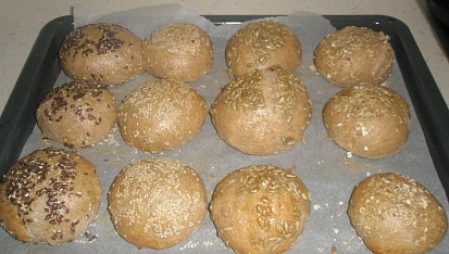 Krok 1: Suroviny dáme do domácí pekárny v pořadí, jak je napsáno a spustíme program těsto. Jakmile je těsto vykynuté, tvoříme bulky, rohlíky či jiné tvary. Potřeme bílkem, posypeme semínky a ještě jednou přetřeme bílkem, aby se semínka dobře přilepila. Necháme cca 15 min odpočinout v teple.