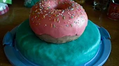 Krok 1: Nejdříve je třeba si připravit dva druhy korpusů - jeden vyšší o menším průměru a druhý nižší o větším průměru (pro případ že budete chtít do dortu např. zapíchat narozeninové svíčky). Pokud nemáte více druhů forem, můžete na nižší korpus použít plech a následně ho vykrojit do kruhového tvaru. Jaký zvolíte druh těsta záleží jen na vás, já jsem jednu část udělala obyčejnou a druhou kakaovou. Musíte však počítat s tím, že budete upečený korpus dále tvarovat, takže by se těsto nemělo moc drolit. Krok 2: Nyní si vyšší korpus vykrájíte do přibližného donutového tvaru, potom ho rozkrojíte, naplníte krémem a opět spojíte. Krok 3: Teď už stačí jen dovykrájet přesný tvar (pozor, lepší je krájet méňe než moc!), všechny nerovnosti zarovnat tak, že dort potřete krémem i z venku. To stejné opakujte i u druhého korpusu. Krok 4: Pokud máte recept na nějakou dobrou potahovou hmotu, klidně ho použijte, já jsem se inspirovala tímto receptem - http://www.toprecepty.cz/recept/15869-varna-modelovaci-hmota-dobra-na-potahovani-dortu/. Krok 5: Nejdříve jsem potáhla spodní část modrou modelovací hmotou. Donut je potřeba potáhnout 2 vrstvami - nejdříve hnědou a následně růžovou potahovou hmotou, kterou vykrájíme tak aby připomínala stékající polevu. Krok 6: Nakonec už jen přiděláme donut na střed modrého "podstavce" pomocí krému a dozdobíme - posypeme donut barevnými posypkami a do jeho středu usadíme předem vymodelovaného Homera.