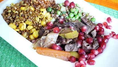 Podávame s ryžou, tarhoňou alebo nokami (ja som dala pohánku), posypané jadierkami granátového jablka.