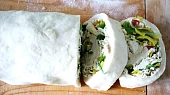 Krok 2: Náplň: na oleji orestujeme na tenké kolieska narezaný pór, pridáme zeleninu, premiešame, kým zelenina nepovolí (cca 1 min, nie viac) a odstavíme.