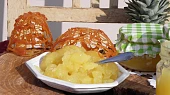 Krok 1: Cukr nasypeme na pánev a podlijeme vodou tak, aby byl po promíchání na pánvi potopený. Cukr přivedeme k varu než začne zlato hnědnout. Odstavíme a provedeme test karamelu na očko z drátku. Krok 2: Návod na test karamelu: tenký drátek, na kterém vytvoříme očko o velikosti třešňové pecky. Ponoříme do karamelu a kapku v očku profoukneme, jestliže vytvoří řetízek nebo několik bublinek, je karamel hotový. Krok 3: Dbejte velmi vysoké pozornosti při práci s karamelem, je velmi horký. A pokud začne zlátnout, odstavte pánev, protože hmota je velmi horká a po odstavení z ohně ještě stále probíhá vaření. Krok 4: Na plech rozložíme pečící papír a z karamelu vytvoříme různé mřížky. (Na obrázku je mřížka přes naběračku). Karamel na plechu je brzy tvrdý, takže můžeme pokračovat. Krok 5: Ananas oloupeme a nakrájíme na kostičky, přidáme 0,5l vody a dáme svařit. Na mírném ohni povaříme do změknutí a přidáme šťávu z jednoho citronu (pouze šťávu bez jader). Před koncem vaření přidáme karamelové mřížky (můžete rozlámat na menší kousky). Na mírném ohni pokračujeme dokud se karamel nerozpustí. Krok 6: Odstavíme a ponorným mixerem opatrně směs ananasu rozmícháme. Krok 7: Nemíchejte dlouho, ještě horké rozlejeme do zavařovacích sklenek, zavíčkujeme a necháme dnem vzhůru asi 5 minut. Potom otočíme, přikryjeme vlhkou textilní utěrkou a necháme vychladnout. Krok 8: Vyrobíte vynikající přesnídávku pro děti a nebo delikátní džem. Přeji dobrou chuť! Pozn.: Jak si doma vyrobit karamelovou mřížku přes naběračku zkusím nahrát na video a vložím odkaz :)
