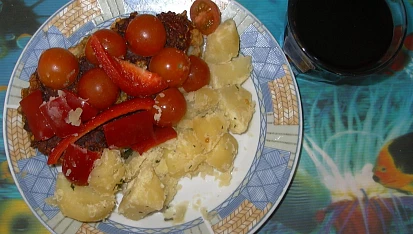 Jako přílohu jsem uvařila brambory okořeněné libečkovou a celerovou natí.Pak jsem dala sušená rajčata a papriku