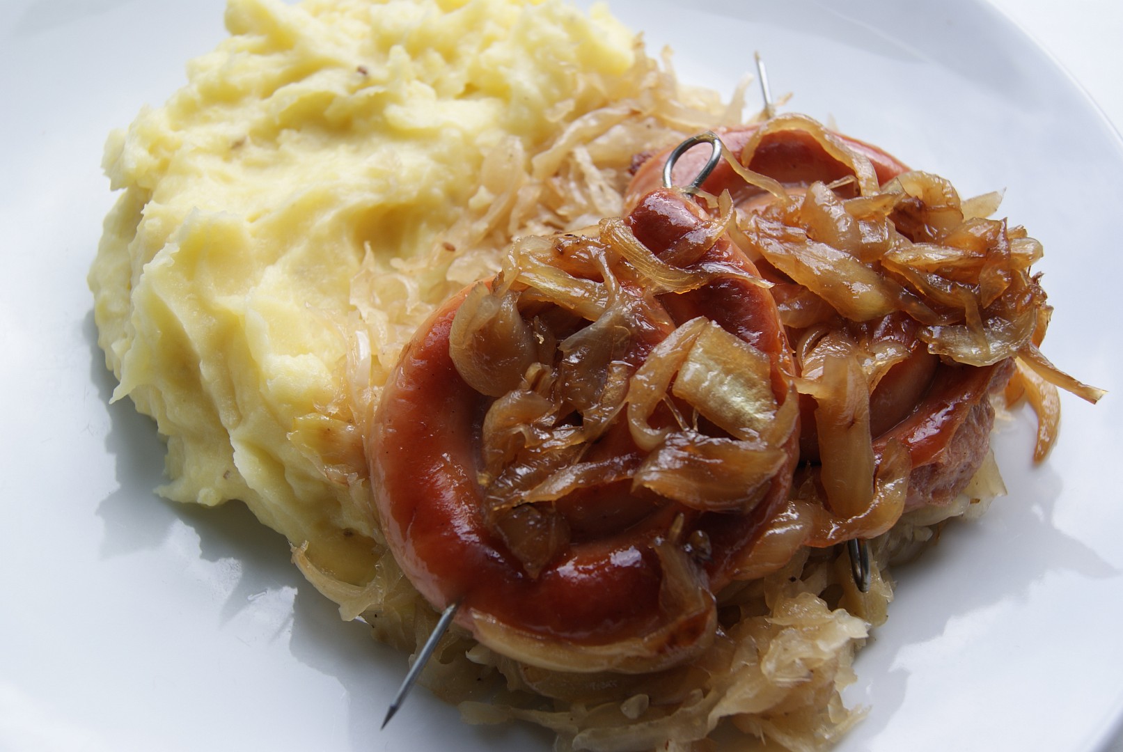 Vinná klobása, pečená na zelí a doplněná karamelizovanou cibulkou, vás dostane netradiční kombinací chutí. Servírovaná s bramborovou kaší, je naprosto báječná. Sami uvidíte, že se vaši strávníci budou olizovat až za ušima.