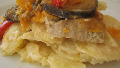 Zapečené telecí plátky s bramborami, paprikami a lilkem