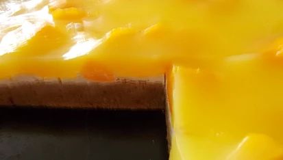 Krok 4: Broskve necháme okapat, pokrájíme a pokládeme na tvarohovou směs.