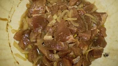 Krok 2: Maso nakrájíme na proužky. Přidáme ho do mísy, promícháme, přikryjeme a uložíme do chladu.