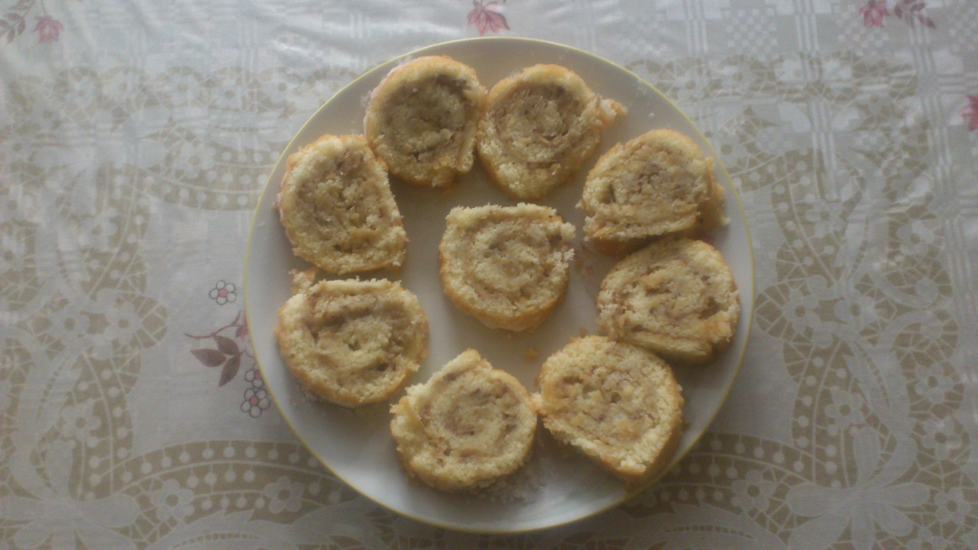 Krok 5: Na teplou roládu rozprostřeme vlhkou utěrku, přiklopíme druhým plechem a obrátíme. Roládu opatrně stočíme pomocí utěrky, pocukrujeme a necháme vychladnout.