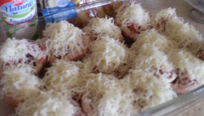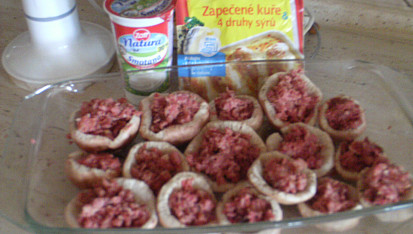 Krok 1: Kloboučky růžovek oloupeme, naskládáme do pekáčku, osolíme, opepříme, naplníme nadrobno posekaným masem, nebo anglickou - použila jsem uzenou krkovičku, která zbyla z nedělního oběda, posypeme strouhaným sýrem a zalijeme smetanou, ve které rozmícháme Magi sáček.