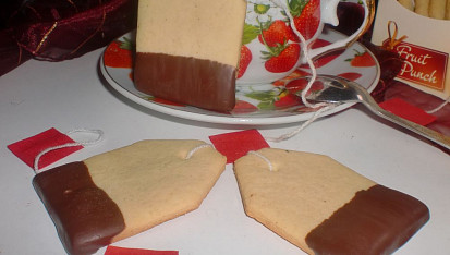 Krok 4: Vychladlé sušenky namáčíme spodní třetinou do rozehřáté čokoládové polevy. Po zaschnutí polevy přivážeme do otvoru šňůrku jako má čajový sáček.
