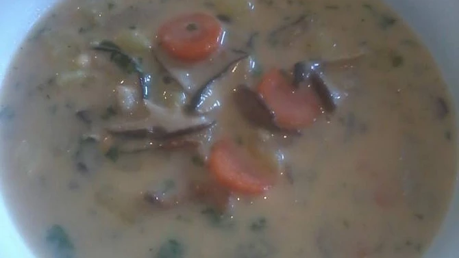 Krok 5: Asi po 15 minutách zahustíme polévku moukou rozmíchanou ve smetaně a vaříme dalších 15 minut.