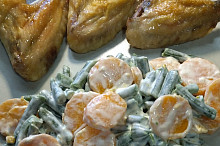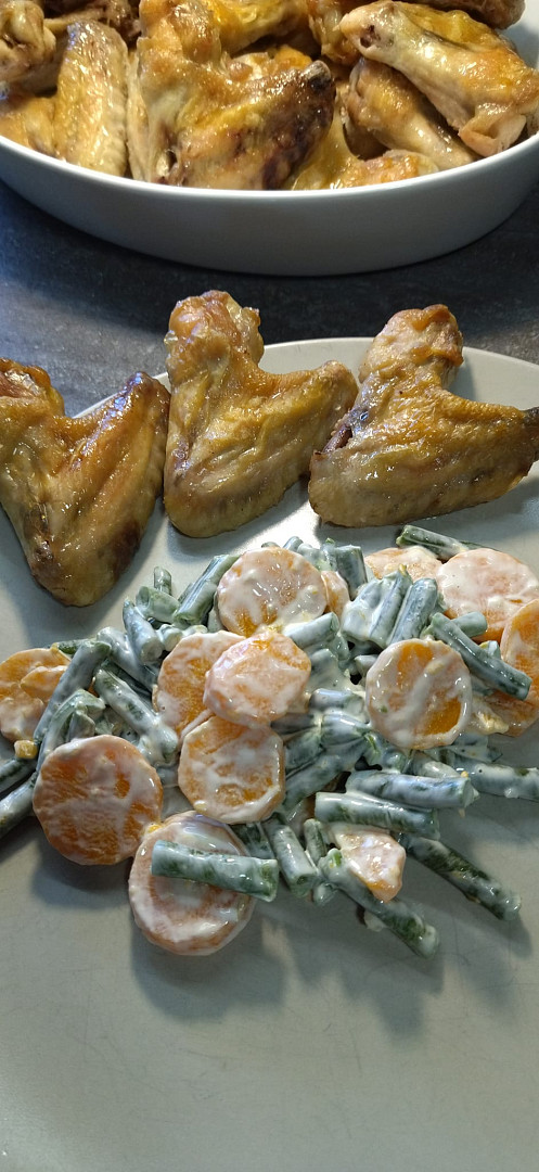 Pečená kuřecí křidýlka s hrubou solí, dušené lusky